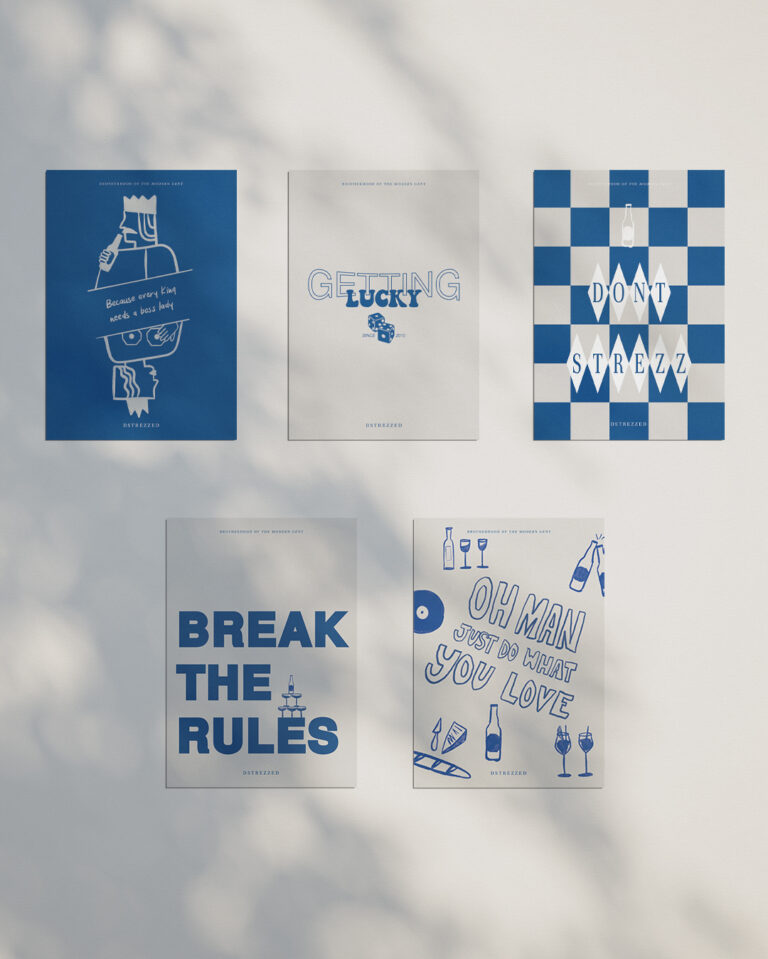 Voor de No Strezz Club ontwierp ik een serie kaarten met een stoere en speelse uitstraling. De illustraties brengen humor en lichtheid samen, helemaal in lijn met de No Strezz mentaliteit. Elke kaart voelt als een kleine knipoog: een reminder om het allemaal niet te serieus te nemen.